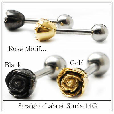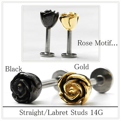 【新商品 オススメ】14ゲージ ストレート 14G ローズ バラ ブラック ゴールド 大 ストレートバーベル ボディーピアス(ボディピアス)【BodyWell】body Jewelry